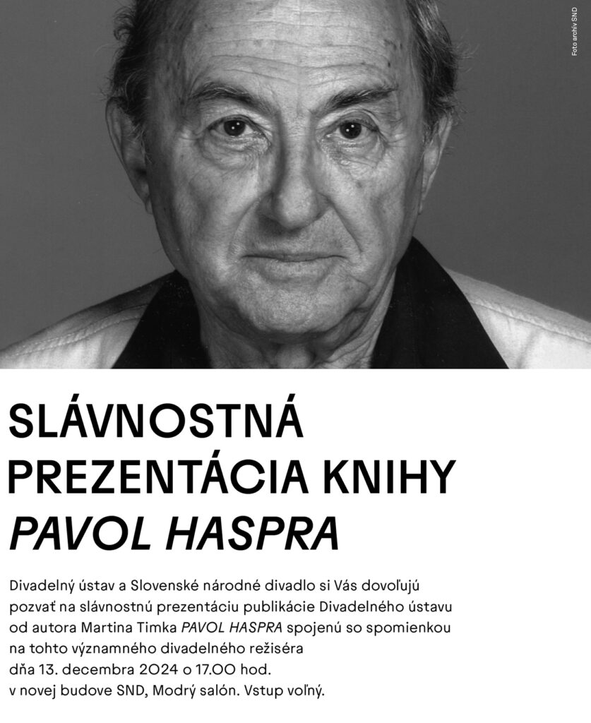 „Po prvej láske – Krajovom divadle Nitra – nasledovala tvorcova najdlhšia perióda umeleckého pôsobenia na našej reprezentačnej scéne v Slovenskom národnom divadle v Bratislave. Analyzujem v nej jednotlivé desaťročia režisérovej práce a pomeriavam umelecké výsledky s celoslovenským kontextom,“ píše v úvode publikácie jej autor M. Timko a pripomína plejádu osobností, s ktorými P. Haspra pôsobil na jednej scéne. „Svoje režijné úspechy budoval najmä prostredníctvom hercov, predovšetkým strednej generácie – Ctibora Filčíka, Karola Machatu, Márie Kráľovičovej, Gustáva Valacha, Ladislava Chudíka, Márie Prechovskej, Zdeny Gruberovej,“ vymenúva M. Timko. Dielo režiséra konfrontuje s ďalšími osobnosťami jeho generácie, ktoré začali režírovať približne v rovnakom období, a zároveň sa ho snaží dať do kontextu s režijnou prácou režisérov staršej či mladšej, pôsobiacich s P. Hasprom v rovnakom súbore. Súčasťou knihy je aj rozsiahla obrazová príloha – fotografie a dokumenty prezentujú nielen významné inscenácie v réžii P. Haspru, ale aj tvorcu v rôznych obdobiach života. „Svojráznosť a neopakovateľnosť diela režiséra Pavla Haspru sa čitateľovi usilujem priblížiť tiež prostredníctvom analýz a charakteristiky dokumentov z pozostalosti, ktorá sa nachádza v Archíve Divadelného ústavu v Bratislave,“ uvádza M. Timko. Slávnostná prezentácia knihy Pavol Haspra sa uskutoční v piatok 13. decembra 2024 o 17.00 hod. v Modrom salóne Slovenského národného divadla a bude spojená so spomienkami na režiséra pri príležitosti jeho nedožitého jubilea 95 rokov.