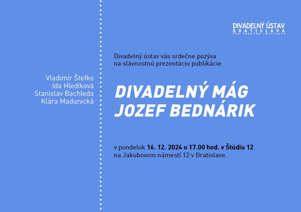 Ďalšou z publikácií, ktorá v decembri vychádza pod hlavičkou Divadelného ústavu, je odborná kniha o mimoriadnom zjave slovenského divadelníctva – režisérovi a hercovi Jozefovi Bednárikovi. Ten svojou invenciou a novátorstvom významne ovplyvnil celé spektrum slovenského i českého divadla – činohru, operu, muzikál, bábkové divadlo a balet, ale tiež televíznu dramatickú tvorbu. Autormi štúdií sú Vladimír Štefko, Ida Hledíková, Stanislav Bachleda a Klára Madunická.