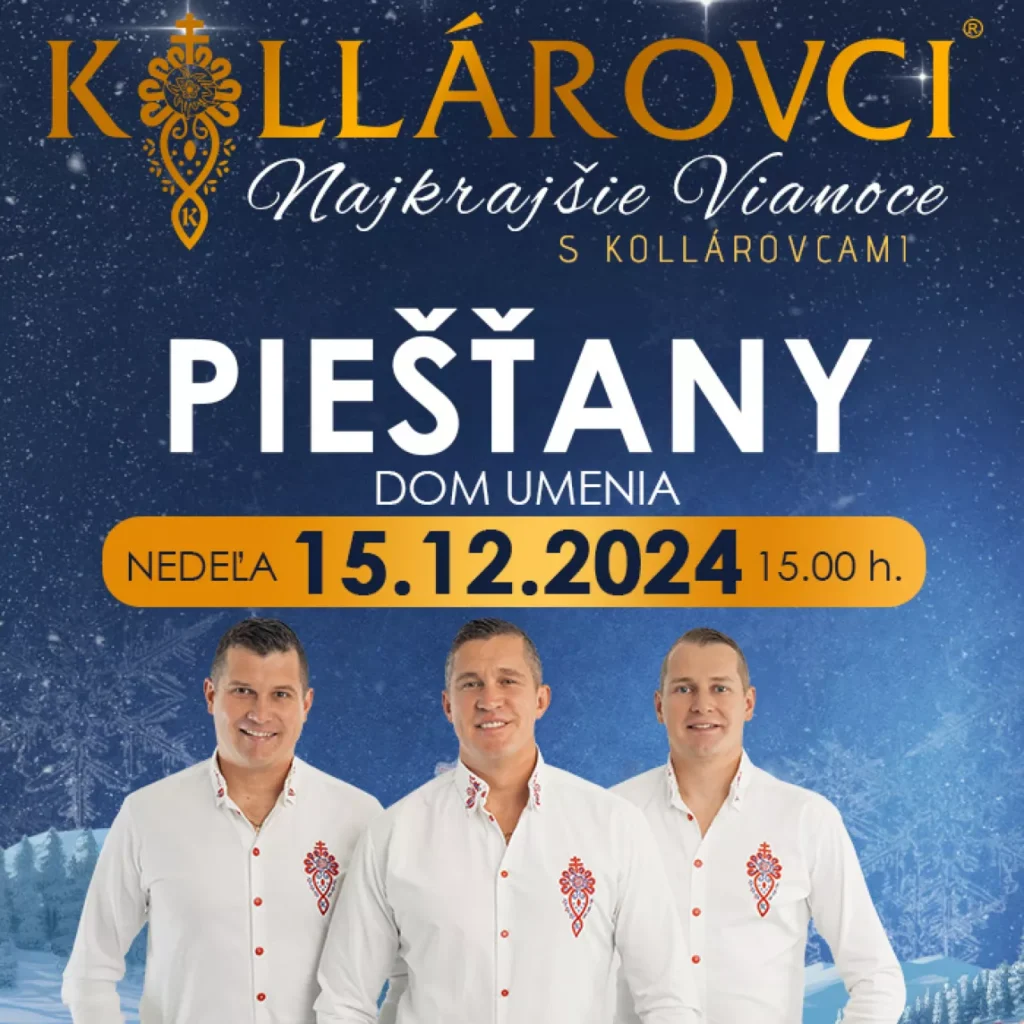 Príďte v nedeľu 15. decembra o 15:00 (alebo 18:00) do Domu umenia zažiť nádhernú vianočnú atmosféru v podaní kapely Kollárovci. Na koncerte zaznejú vianočné koledy a ďalšie známe hity skupiny. Doprajte si predvianočné hudobno-zábavné uvoľnenie v podaní Kollárovcov, pri ktorom načerpáte veľa pozitívnej energie.