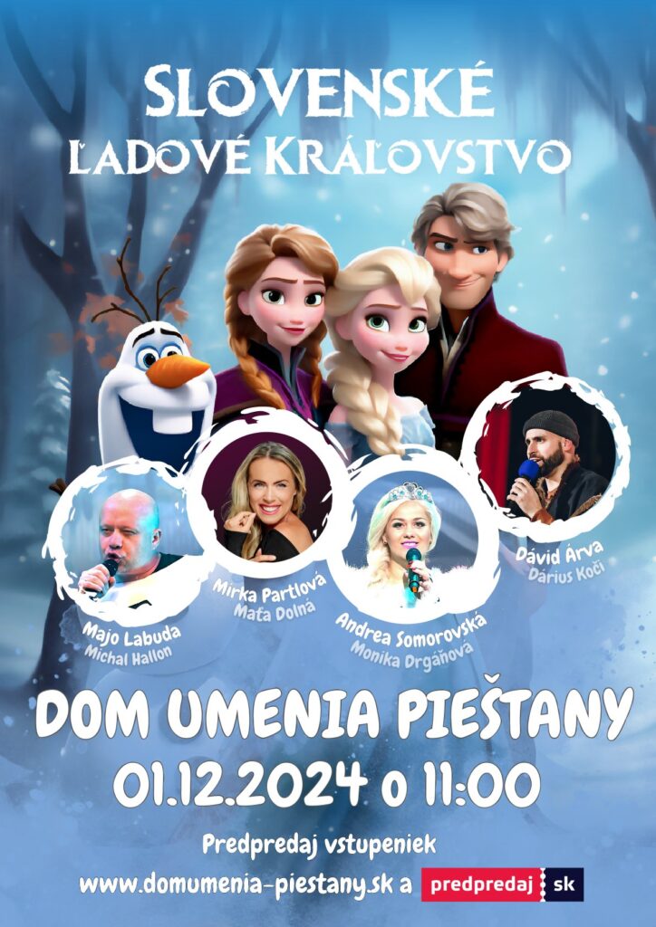 V nedeľu 1. decembra o 11:00 sa odohrá Muzikál pre deti vo Veľkej sále. Vynovené divadelné predstavenie na motív jednej z najznámejších rozprávok Vás vtiahne do ľadového kráľovstva plného zábavy a hudby. Vychutnajte si skvelé spevácke a herecké výkony v podaní známych slovenských hercov a spevákov. Očakávajte veľa energie a interakcie s divákmi a známe piesne z rozprávky, ktoré si s nami určite radi zaspievate. Na predstavení sa zabavia nielen deti, ale aj dospelí diváci. Účinkujú: Marián Labuda ml. (Olaf), Andrea Somorovská (Elza), Mirka Gális Partlová (Anna), Dávis Árva (Kristoff). Dĺžka predstavenia 55 min.; pre deti do 1 roka vstup zdarma; vhodné pre deti od 3 rokov.