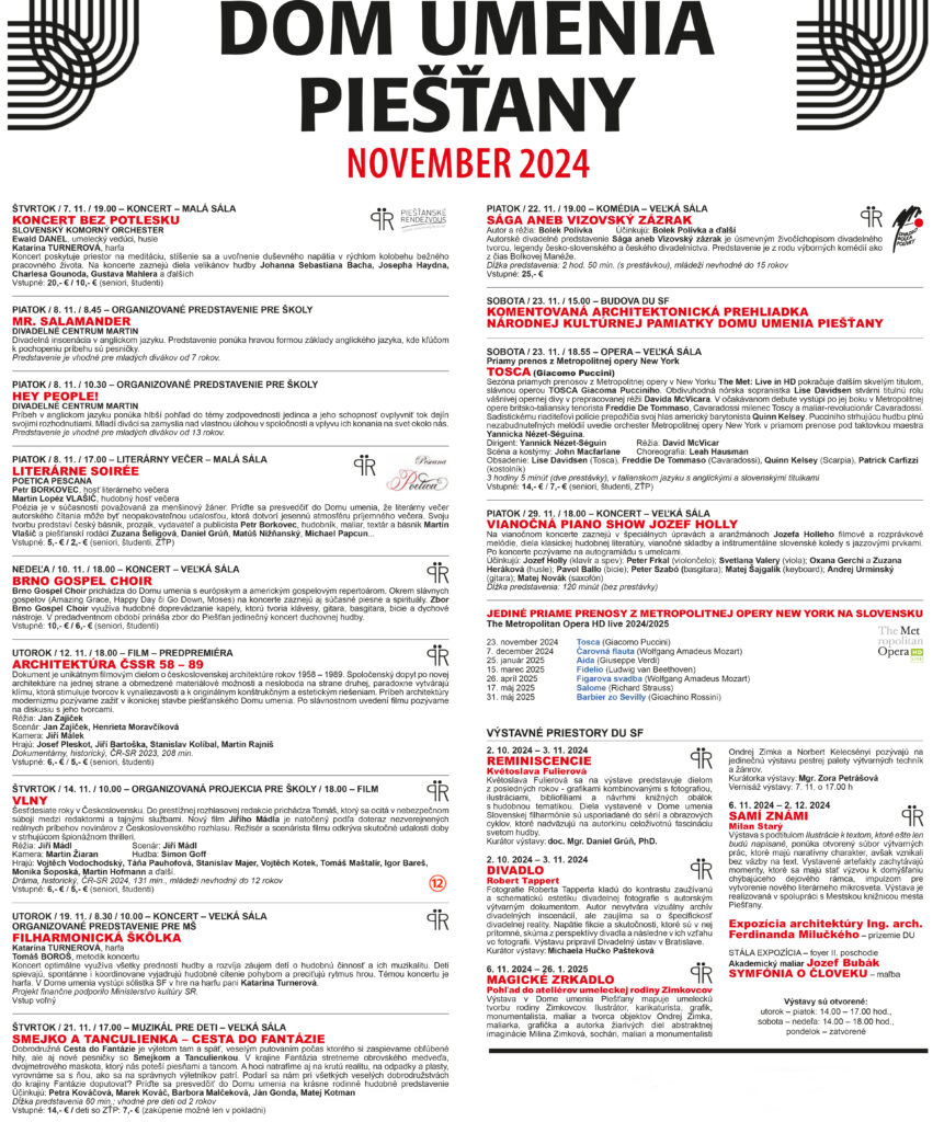Dom umenia Piešťany v minulosti hostil nejednu neopakovateľnú udalosť, cez medzinárodný filmový festival až po vystavované umenie. Najbližšiu polku novembra si pripomenieme aktuálny film o dôležitej téme slobody v československom rozhlase v šesťdesiatych rokoch, rodičia s deťmi sa zasmejú pri Ceste do fantázie pre deti od 2 rokov, alebo si budeme môcť vypočuť poéziu súčasných spisovateľov, ako sú Michael Papcún, Matúš Nižňanský, ktorí sa narodili v Piešťanoch a atmosféru mesta majú v krvi, a vlastnej tvorbe.