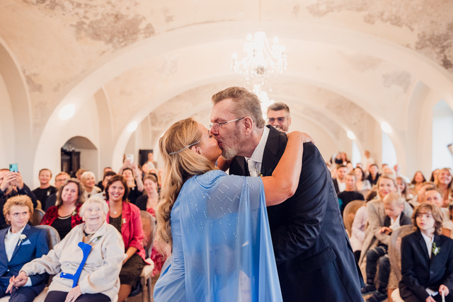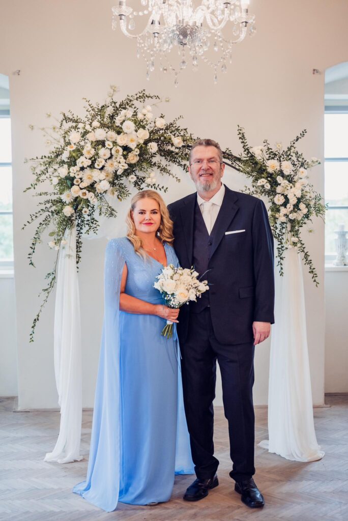 Nevesta mala oblečené netradičné modré šaty a vyzerala ako z rozprávky. Šaty vymyslela a zrealizovala jej dlhoročná kamarátka, módna návrhárka Tatiana Kováříková.