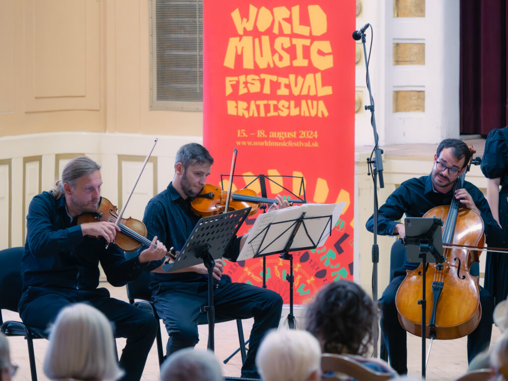 V diele ďalšieho autora – významného etnomuzikológa Bélu Bartóka v duete pre dvoje huslí č. 15 znelo prepojenie s Vojenskou piesňou (Katonanóta). Následne sa hudobníci vrátili k Suchoňovej Sonatíne. Medzi najkrajšie patrila (za mňa osobne) pomalá časť Andante Sostenuto s prepojením na pieseň Tam na lúke zelenej z Horehronia. Počuť spev a následne prekrásnu melódiu vo violončele, človek sa až nevedel rozhodnúť, ku ktorej variante sa má citovo prikloniť. Zrazu mu klavírna verzia známej Suchoňovej skladby nepripadala dostatočne farebná, aj keď silu jej emocionálnej hĺbky rozhodne nemožno poprieť ani v jednej z verzií. Aj tretia časť Sonatíny ukázala na spojenia s podpolianskou piesňou a dokonca aj asociatívne uvažovanie muzikantov, hľadajúcich inšpiračné zdroje našich autorov (znel raslavický vezbunk). Niet divu, že v niektorých momentoch autor tejto koncepcie a prvý huslista Spectrum Quartett tancoval. A v publiku sa zjavne stretli aj priaznivci ľudovej hudby – atmosféra bola uvoľnená a spontánna. Aj také sú koncerty žánru world music – všeobjímajúce, otvorené rôznym žánrom a prinášajúce radosť z hudby.