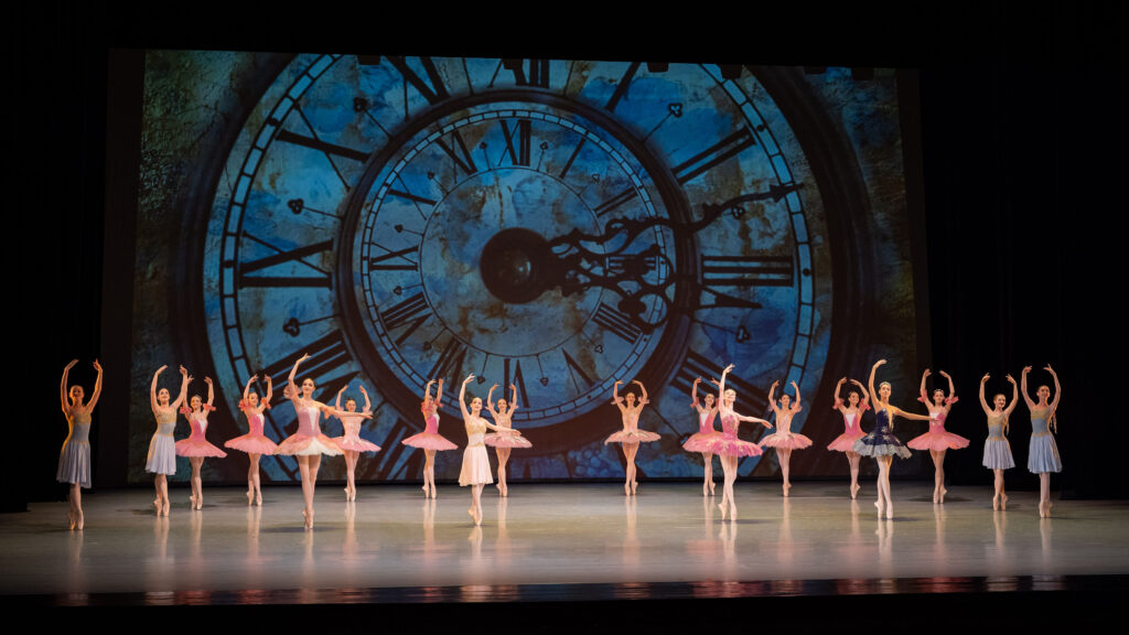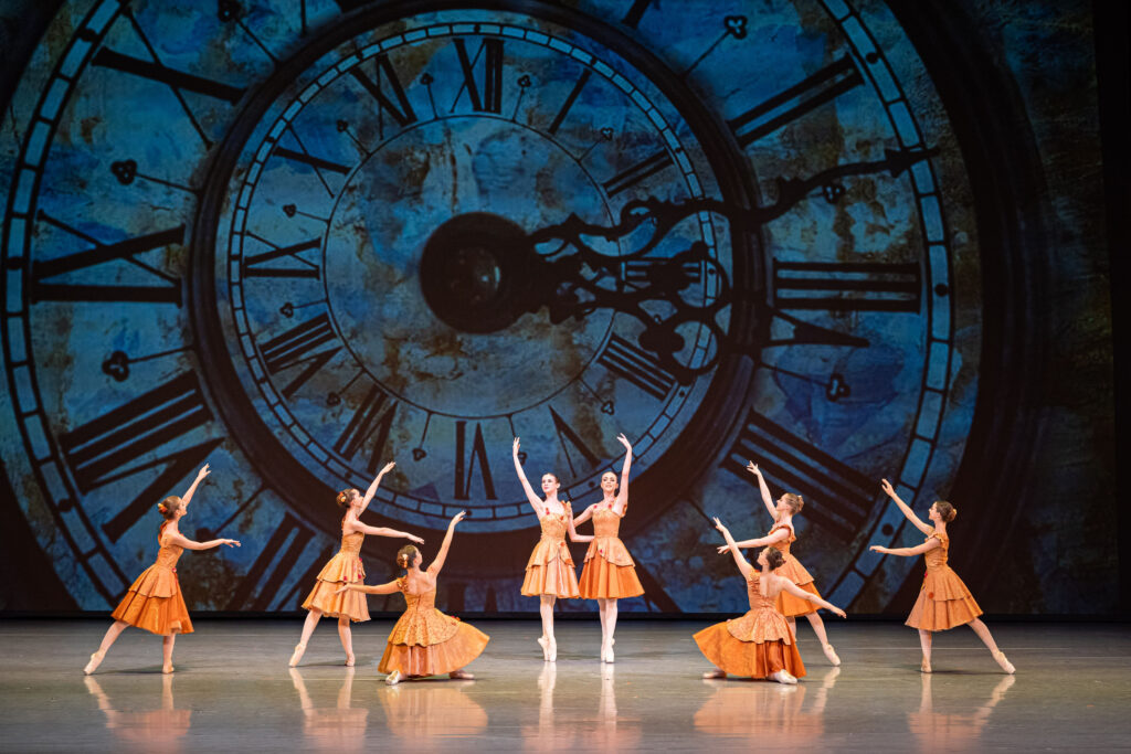 V Hodinovom valčíku sa predstavili žiačky 5. a 7.A ročníka v naštudovaní Eleny Chetvernye. Mal v sebe valčíkovú ľahkosť a sebavedomé, dobré cítenie rytmiky – zvýraznenie prvej, ťažkej doby. Po tomto tematickom tanci sme sledovali čísla, ktoré na seba myšlienkovo a koncepčne nadväzovali.