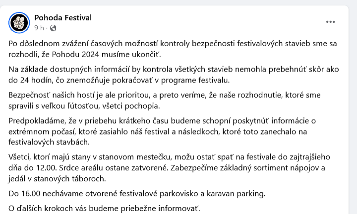 Organizátori najprv vydali stanovisko, že musia stanoviť rozsah škôd a bezpečnosť konštrukcií stanov, až následne rozhodnú, či bude festival predčasne ukončený. Po zvážení času na kontrolu stavieb sa však napokon rozhodli Pohodu ukončiť. „Na základe dostupných informácií by kontrola všetkých stavieb nemohla prebehnúť skôr ako do 24 hodín, čo znemožňuje pokračovať v programe festivalu,” oznámili.