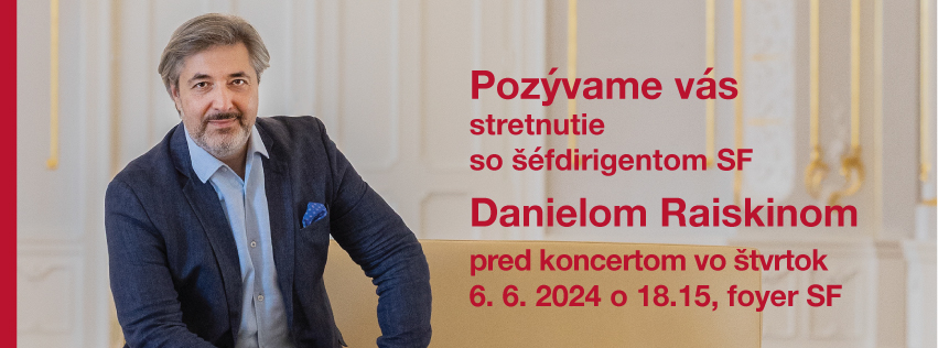 Vo štvrtok a piatok 6. a 7. júna 2024 sa budú konať záverečné koncerty cyklu DE pod taktovkou šéfdirigenta Daniela Raiskina. Pred štvrtkovým koncertom vás pozývame na predkoncertné stretnutie, kde sa naladíte do hudobného diania večera v Koncertnej sieni. Rozhovor o programe koncertu vedie dramaturg Juraj Bubnáš, ktorý pútavé rozprávanie šéfdirigenta tlmočí do slovenského jazyka. Stretnutie sa začne o 18.15.