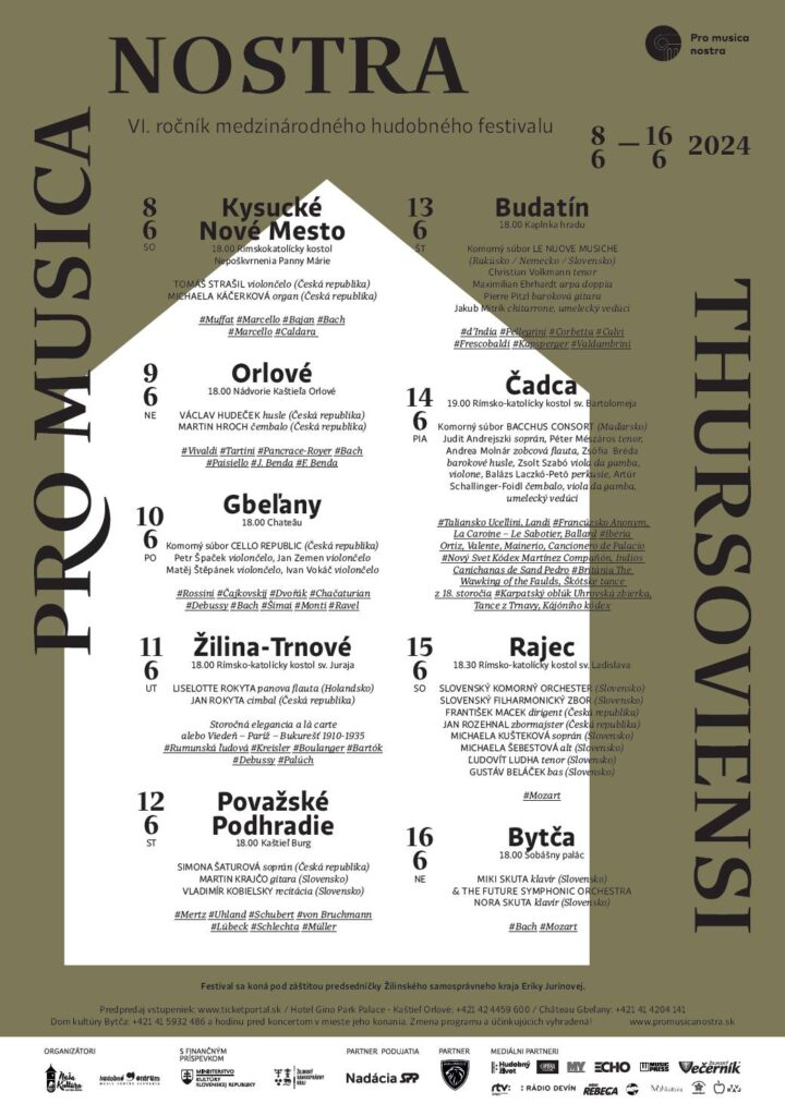Spoločne so Slávkou Ferencovou z Hudobného centra robíme dramaturgiu a pozývame súbory. Zároveň chceme dosiahnuť, aby participácia sakrálnej a svetskej hudby v kombinácii so stavbami bola rozdelená zhruba na polovicu. Nie je naším zámerom vyberať len kostoly alebo iba kaštiele. Zámer sa podaril, prvý festival na severozápadnom Slovensku v roku 2018 okamžite zarezonoval. Krásna myšlienka rýchlo vytvorila v ľuďoch istú väzbu. V tom istom roku ma oslovil riaditeľ Hudobného centra pán Igor Valentovič, či by sme po prvom našom úspešnom ročníku, vtedy sa volal Pro Musica Nostra, teda Pre našu hudbu, súhlasili, či by podobné formáty nemohli následne vzniknúť aj v iných krajoch Slovenska. Naše občianske združenie sa volá Naša kultúra/ Cultura Nostra, takže z tohto názvu sa odvíjal aj prvotný festivalový názov. Hneď na jeseň toho roku vznikli festivaly Pro Musica Nostra Nitriensi na Dolnej Nitre a v Tekove a Pro Musica Nostra Sarosiensi na Šariši. Aby sme festivaly Pro Musica Nostra rozlíšili, každý má svoj latinský geografický prídomok. Jediným názvom, ktorý nie je spätý s historickým názvom kraja, teda župy, je práve náš festival Pro Musica Nostra Thursoviensi. Týka sa severozápadnej oblasti bývalej trenčianskej župy, v ktorej Juraj Thurzo pôsobil. Renesančný človek, nielen obdobím v ktorom žil, ale aj svojimi činmi, kultúrnymi, cirkevnými, organizačnými, vzdelávacími a humanistickými. Dnes máme na Slovensku až päť festivalov – aj Pro Musica Nostra Tyrnaviensi a Pro Musica Nostra Gemeriensi (historický názov - Gömöriensi), ktorých názvy znejú na prvé počutie niekedy zvláštne, ale po latinsky je to tak správne. Máme to šťastie, že koncerty sa organizujú každoročne, pritom každý festival je trošku iný. Napríklad na Gemeri je veľmi veľa menších románskych a ranogotických unikátnych kostolov, kde sa dramaturgia aj obsadenie musí prispôsobiť, proste sa tam zmestí menej ľudí.