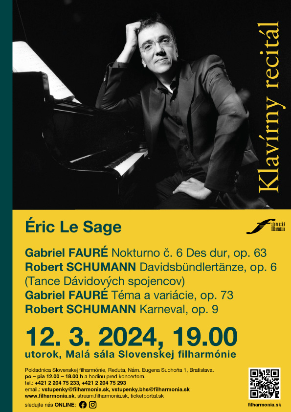 Po nich sa Éric Le Sage vráti ku klavírnej tvorbe Gabriela Faurého, zaradením jeho skladby Téma a variácie, op. 73. Spolu s Nokturnom č. 6 Des dur patria k jeho najhrávanejším klavírnym skladbám vôbec. Tému a variácie venoval svojej žiačke, priateľke, speváčke a klaviristke Thérèse Roger. Premiéra diela sa konala 10. decembra 1896 v londýnskej St James Hall v podaní klaviristu Léona Delafosseho, rok po jeho skomponovaní. Záver bude patriť Robertovi Schumannovi a jeho cyklu Karneval op. 9, ktorý tvorí 22 charakteristických skladieb. Skladateľ ho skomponoval v rokoch 1834 – 1835.