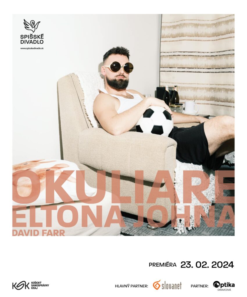 Bill je oddaný fanúšik britského futbalového klubu Watford. Teda bol... až do jedného osudného zápasu, keď brankára oslepí lúč slnka odrazený od okuliarov Eltona Johna. Watford významný zápas prehrá a Bill sa zrúti. Utiahne sa do svojho bytu takmer bez nábytku, nestretáva sa s ľuďmi, nechodí von a na DVD prehrávači dookola sleduje záznam nešťastného gólu. Jedného dňa ho však po rokoch nečakane navštívi brat Dan s členmi svojej naoko úspešnej kapely. Prečo prišiel práve teraz? A čo sa stane, keď sa hudobníci stretnú s Billovou milenkou Julie, ktorá mu nosí nákupy, a s jej šestnásťročnou dcérou Amy? Dozviete sa vo výbornej komédii Davida Farra, ktorá zachytáva vtipné charaktery v humorných situáciách, ale zároveň s nadhľadom a iróniou zobrazuje krehké vzťahy medzi súrodencami, kamarátmi, deťmi a rodičmi či potenciálnymi partnermi. Spišské divadlo prináša hru Okuliare Eltona Johna v réžii Miloslava Kráľa.