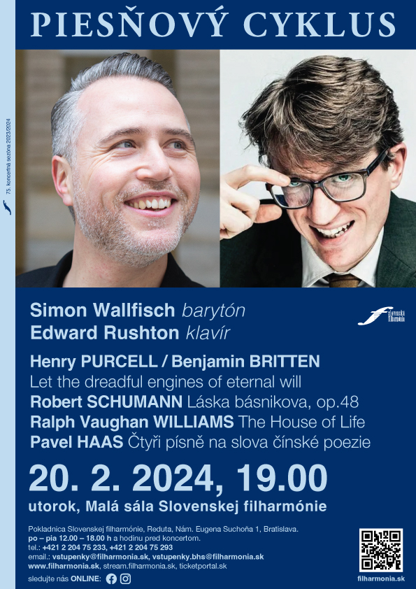 Simon Wallfisch otvorí utorkový večer piesňou anglického skladateľa Henryho Purcella Let the dreadful engines of eternal will, ktorá zaznie v úprave anglického skladateľa 20. storočia Benjamina Brittena. „Inšpirovaný Purcellom, odštartoval Britten v roku 1943 svoju púť nazvanú ako Purcell Realizations, v rámci ktorej uchopil Purcellove piesne, árie a duety v intenciách anglického slovíčka realize (realizovať/pochopiť/uskutočniť/poňať...). To znamenalo vdýchnuť nový umelecký život starej hudbe s uplatnením súčasných kompozičných prostriedkov. Za svoj hlavný cieľ považoval Britten pokúsiť sa obnoviť a vzkriesiť pri zhudobnení slov nádheru, slobodu a vitalitu anglického jazyka, ktorá bola podľa neho od Purcellovej smrti neobvykle zriedkavá,“ píše v texte ku koncertu hudobný teoretik Andrej Prachár.