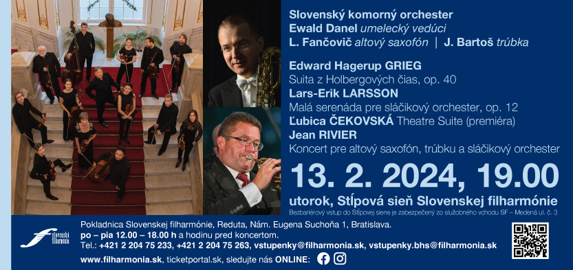 Čas a miesto konania koncertu: 14.2. od 18:00 v Koncertnej sieni Slovenskej Filharmónie, Bratislava. Vstupenky tu.