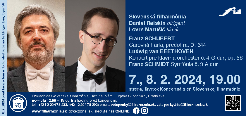 Opera Čarovná harfa Franza Schuberta sa na svetových javiskách neuchytila, no jej predohra sa hráva dodnes. Už v takzvanom strednom tvorivom období riešil Ludwig van Beethoven situácie nevšedne a atypicky. Štvrtý koncert pre klavír, reformné dielo bonnského rodáka, je jedným z príkladov jeho ambícií posúvať chod udalostí vpred. Od vstupných taktov, zverených nečakane klavíru bez orchestrálnej expozície sa odohráva pred poslucháčom nádherný príbeh. Vo finále pozorné ucho začuje náčrty témy Finále Deviatej symfónie. Úplnou raritou je však stredná časť, prosebné sekvencie klavíra narážajú na drsný zvuk orchestra, predzvesť expresívnych diel autorov 20. storočia. Dedičstvo neskorého romantizmu sa v tvorbe bratislavského rodáka Franza Schmidta spája s novými smermi 20. storočia. Chorvátsky klavirista Lovre Marušić vyhral v roku 2021 Medzinárodnú klavírnu súťaž v Clevelande, predtým vyhral niekoľko ďalších veľkých súťaží, takže na filharmonický debut tohto tridsaťjedenročného mladíka sa môžeme jednoznačne tešiť.