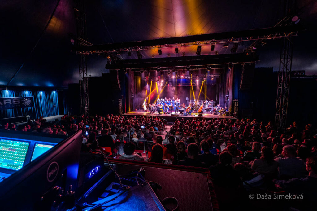 Obyčajný biely stan s dvoma modrými hviezdami sa nachádza ani nie tak ďaleko od centra a úprimne sa priznám, považovala som ho za mobilný cirkus. Keď sa tam už vynímal pomerne dlho a nemizol, nerotoval do ostatných miest, zistila som, že ide o priestor na koncerty, divadlo, tanec, a iste, slúži aj na komerčné účely, akými sú konferencie. Moja premiéra v STARS Auditoriu bola práve koncom januára – 21.1., kedy sa uskutočnil zo septembra preložený koncert Filmovej hudby Les Sirènes, ale i malých Sirénčat. Poznáte to – pozriete si vopred na nete priestor, ktorý zvnútra vyzerá luxusne, vkusne, dokonca aj esteticky prijateľne – fotografie už na pohľad vytvárali dojem divadelného priestoru. A hneď im nedôverujete, nie je predsa možné, aby v dnešnej dobe vzniklo niečo takéto pekné, príjemne moderné, luxusné a zároveň vkusné (niekedy mám pocit, že v súčasnej dobe sa tieto adjektíva vylučujú). A ono to nie je klamstvo na diváka – v skutočnosti je to ešte vkusnejšie a krajšie. A hlavne, dobre zorganizované. Pre lenivcov, ktorí neprejdú ani 50 metrov do obchodu bez auta a nebudú sa ani za svet správať ekologicky a využívať MHD, dobrá správa: zaparkujete pred divadlom, dokonca na prvú šupu, ešte k tomu 10 minút pred predstavením (niektorých zlozvykov vás nezbavia ani novoročné predsavzatia, treba sa s tým zmieriť). Dlhý rad návštevníkov s lístkami neodradí, odsýpa jedna radosť vďaka dobrej organizácii a hlavne uvádzačkám.