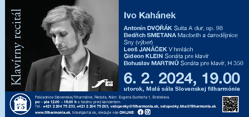 Ivo Kahánek v roku 2007 debutoval na BBC Proms v Londýne pod taktovkou Jiřího Bělohlávka, v roku 2014 vystúpil po boku Berlínskych filharmonikov pod taktovkou Sira Simona Rattla. Spolupracuje so svetovými orchestrami a aktívne sa venuje komornej hudbe. Jeho klavírny recitál v Malej sále Slovenskej filharmónie bude oslavou Roku českej hudby. Program si umelec zostavil z diel českých skladateľov 19. a 20. storočia - Dvořáka, Smetanu, Janáčka a Martinů, ktorých obohatí zriedkavo hrávaná sonáta Gideona Kleina.