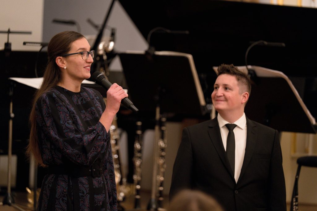 Vedúcim súboru je Matej Sloboda, ktorý koncert dirigoval – úvodom vystúpil pred publikum, aby skladbu predstavil. Rozhovor viedla Kristína Gotthardtová, dramaturgička komorných cyklov Slovenskej filharmónie. Schnee” alebo „Sneh“ súčasného dánskeho skladateľa Hansa Abrahamsena (1952) je fascinujúce hudobné dielo, ktoré zrkadlí náladu zimy ako ročného obdobia. Ide o inštrumentálny cyklus, ktorý už bol vo svete mnoho krát uvedený, vyšiel aj na nosičoch – je klasikou aktuálneho storočia. Formálne predstavuje desať kánonov inšpirovaných kánonmi J. S. Bacha. Je to hudba evokujúca samotu severskej krajiny, ticho a pokoj, no najmä istú formu intimity. Ak je hudobný zážitok doplnený o vizuálne efekty, jej účinok sa znásobuje.