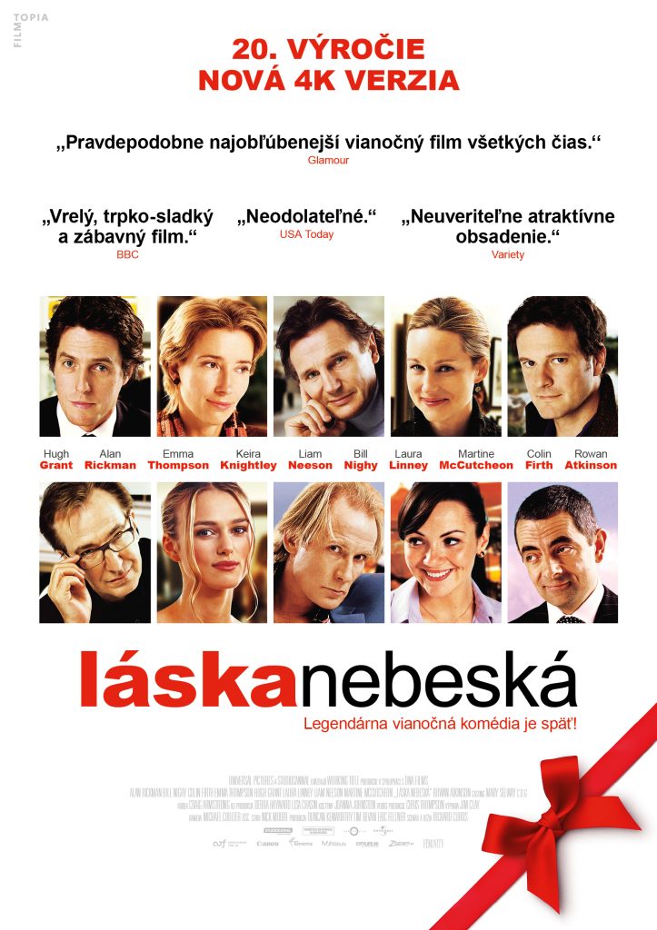 Dej filmu Láska nebeská (2003), ktorého autorom je jeden z najznámejších britských komediálnych scenáristov Richard Curtis, začína presne 5 týždňov pred Vianocami. Práve kombinácia vianočnej atmosféry a vtipných, ale aj dojemných príbehov, je to, čo robí z Lásky nebeskej dokonalý filmový koktail. Desať rôznych príbehov a ich hrdinovia ukazujú, že láska si nevyberá – či už sa týka britského premiéra, rockovej hviezdy, alebo malého chlapca.