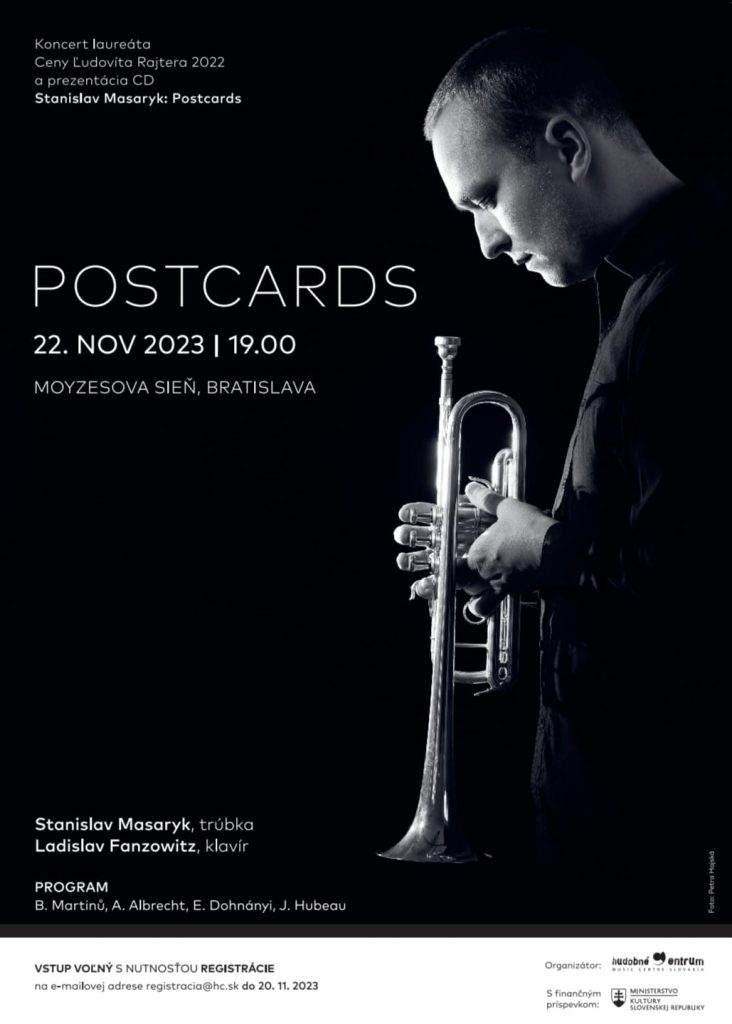 Na koncerte zaznejú diela Bohuslava Martinů, Alexandra Albrechta, Ernő Dohnányiho a Jeana Hubeaua a súčasťou podujatia bude aj prezentácia nového CD-albumu Stanislav Masaryk: Postcards z produkcie Hudobného centra, zrealizovaného v súvislosti s Cenou Ľudovíta Rajtera v Lisztovom centre v rakúskom Raidingu. Na nahrávke profilového albumu so Stanislavom Masarykom spolupracovali klavirista Ladislav Fanzowitz a trubkári Ľubomír Kamenský (Slovenská filharmónia) a Marek Vajo (Česká filharmónia).