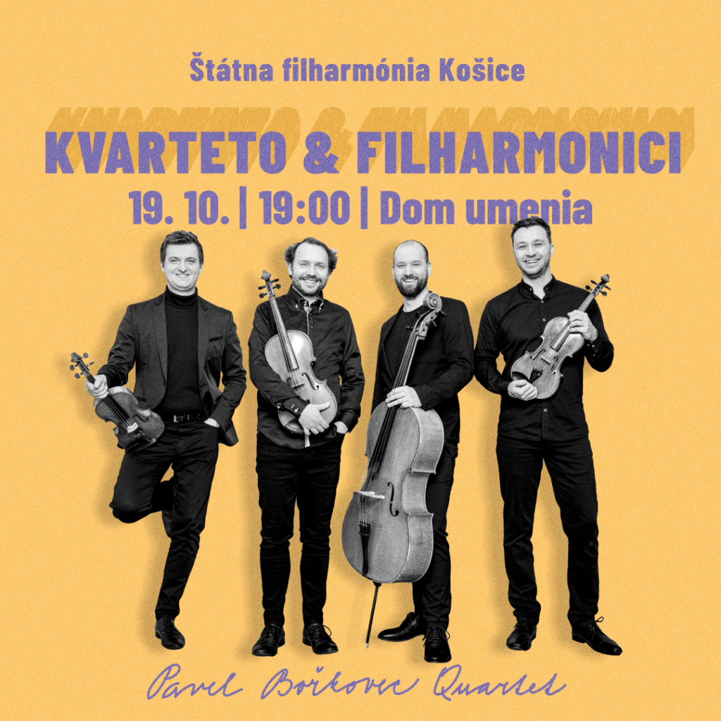 Koncert z abonentného cyklu A s názvom KVARTETO & FILHARMONICI sa uskutoční vo štvrtok 19. októbra 2023 o 19:00 v Dome umenia. Cena vstupného je 14/12/10 € – zľavnené 11/9/7 € – lóža 18 €. Vstupenky na podujatia Štátnej filharmónie Košice sú v predaji aj so zľavami vo vstupenkovej pokladnici Domu umenia od pondelka do štvrtka (10:00 – 12:00, 14:00 – 17:00) a hodinu pred podujatím. Vstupenky sú v predaji aj online na webe Štátnej filharmónie Košice www.sfk.sk alebo cez link https://program-sfk.colosseum.eu/. Zľavy je možné uplatniť aj pri online nákupe.