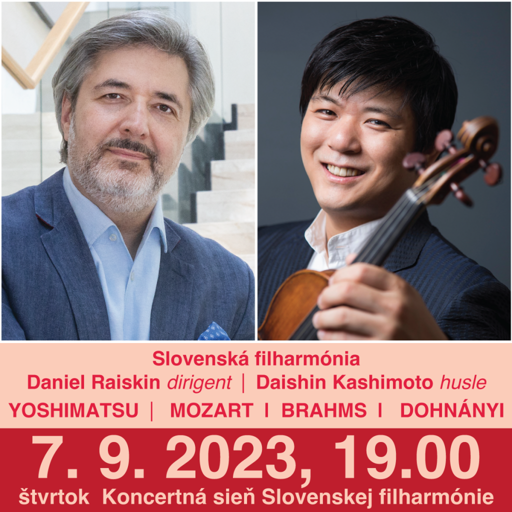 Vo štvrtok 7. septembra sa v Slovenskej filharmónii uskutoční prvý mimoriadny symfonický koncert orchestra Slovenská filharmónia so šéfdirigentom Danielom Raiskinom. Koná sa v spolupráci s Veľvyslanectvom Japonska v Slovenskej republike a pripomenieme si na ňom viac ako sto rokov trvania slovensko-japonských diplomatických vzťahov. Záštitu nad koncertom prevzala ministerka kultúry SR Silvia Hroncová. Sólistom večera bude japonský husľový virtuóz Daishin Kashimoto, koncertný majster Berlínskych filharmonikov. Koncert sa začne o 19.00.