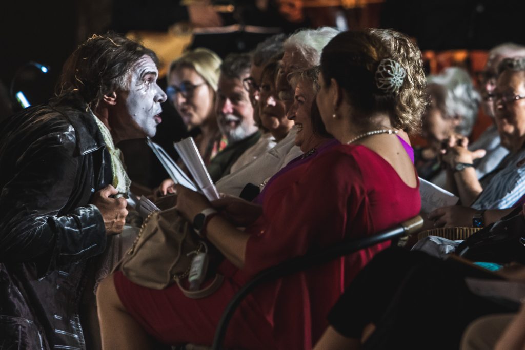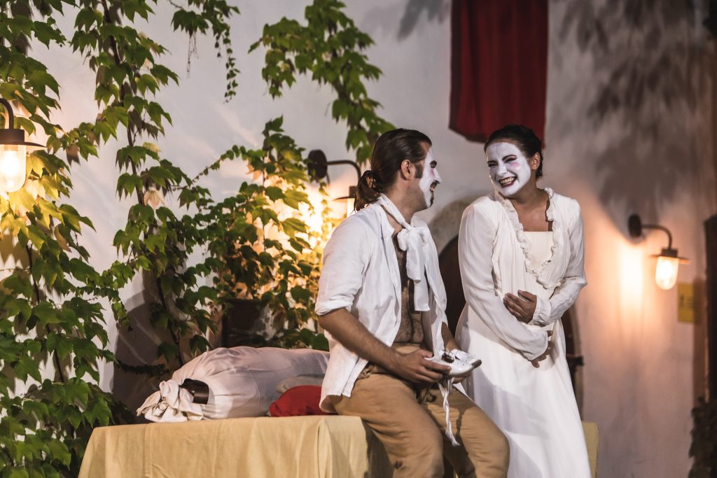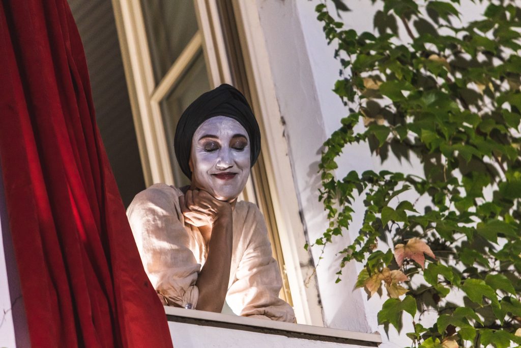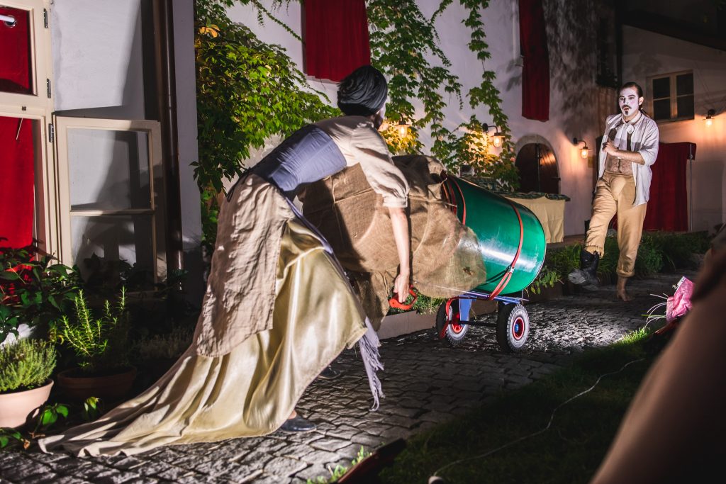 Protagonisti nevyužili len priestor domu Arsénie, v ktorej sa scéna nachádza, domnelú ulicu pred domom, ktorú tvoril chodníček v záhrade, ale i priestor pódia, na ktorom sa nachádzal orchester. Situovanie orchestra po pravom boku hľadiska sa ukázalo nielen ako akusticky vhodné, ale i priestorovo. Zvuk sa dobre niesol do vonkajšieho priestoru smerom k divákom, ktorí svoju pozornosť mohli obrátiť nielen na trojicu spevákov, ale i na hudobníkov. A samozrejme, protagonisti dostatočne využili aj priestor, kde sedeli samotné diváci – na intenzívnu neverbálnu komunikáciu s nimi.