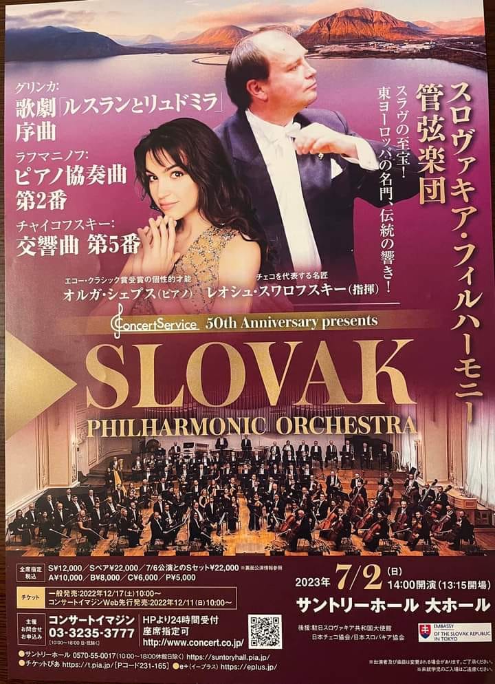 Pôvodne bol umelecký zájazd do krajiny vychádzajúceho slnka plánovaný v roku 2020, kedy sa z dôvodu koronavírusu neuskutočnil. Turné s plánovaným programom sa presunulo na leto 2023. Slovenská filharmónia sa v Japonsku predstaví s dvoma dirigentmi – šéfdirigentom SF Danielom Raiskinom a pravidelným hosťom našich koncertných sezón Leošom Svárovským. Päť koncertov v interpretácii nášho telesa zaznie v troch japonských mestách (Tokio, Yokohama, Akita). Sólistami budú dvaja mladí virtuózi – nemecká klaviristka Olga Scheps a japonský violončelista Tatsuki Sasanuma. Turné otvorí nedeľný koncert v slávnej tokijskej Suntory Hall, kde sa filharmonici predstavia aj vo štvrtok 6. júla 2023. Na programoch budú znieť diela Bedřicha Smetanu, Antonína Dvořáka, Michaila Ivanoviča Glinku, Sergeja Rachmaninova a Piotra Iľjiča Čajkovského. Program koncertov japonského turné pod taktovkou oboch dirigentov si v uplynulých týždňoch vypočuli aj návštevníci Slovenskej filharmónie. Filharmonici pricestujú z Japonska do Bratislavy v pondelok 10. júla 2023.