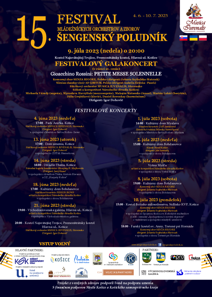 Festival vyvrcholí v nedeľu 9. júla FESTIVALOVÝM GALAKONCERTOM v Kostole Premonštrátov v Košiciach, na ktorom sa predstavia medzinárodný orchester a zbor „Šengenský poludník“ vytvorený z účastníkov festivalu. V rámci svätej omše zaznie výnimočná PETITE MESSE SOLENNELLE so sólistami a korepetítormi Opery Národného divadla Košice Michaelou Várady (soprán), Myroslavou Havryliuk (mezzosoprán), Maksymom Kutsenkom (tenor), Marián Lukáčom (barytón), Júliou Grejtákovou (klavír) a Danielom Boronkayom (harmónium) pod taktovkou Igora Dohoviča.