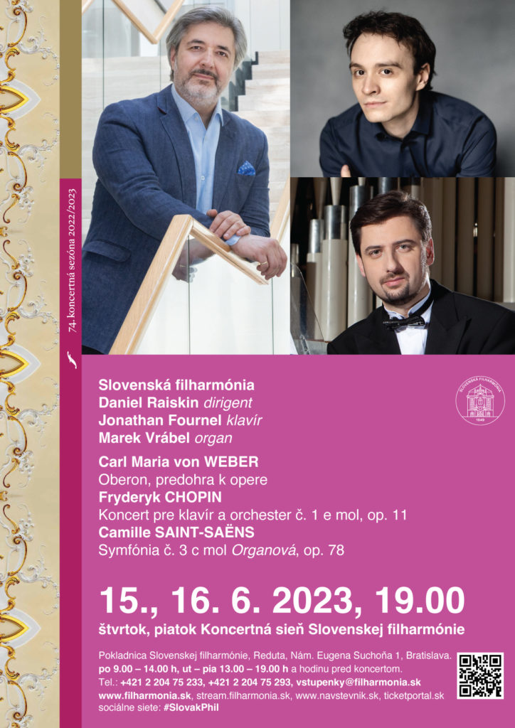 Na úvod večerov zaznie v naštudovaní šéfdirigenta predohra k opere nemeckého romantika Carla Mariu von Webera Oberon. V interpretácii Jonathana Fournela, držiteľa mnohých ocenení a víťaznej ceny medzinárodnej Súťaže kráľovnej Alžbety v belgickom Bruseli v roku 2021 zaznie Koncert pre klavír a orchester č. 1 Fryderyka Chopina, ktorý je jedným z najpopulárnejších diel pre tento nástroj. "Básnik klavíra" skomponoval svoje dva klavírne koncerty - Koncert pre klavír a orchester e mol č. 1 op. 11 a Koncert pre klavír a orchester f mol č. 2 op. 21 v rokoch 1829 - 1830, po jeho návrate do Varšavy. Napriek tomu že patria medzi jeho rané diela sú považované za vrchol jeho varšavskej klavírnej tvorby.